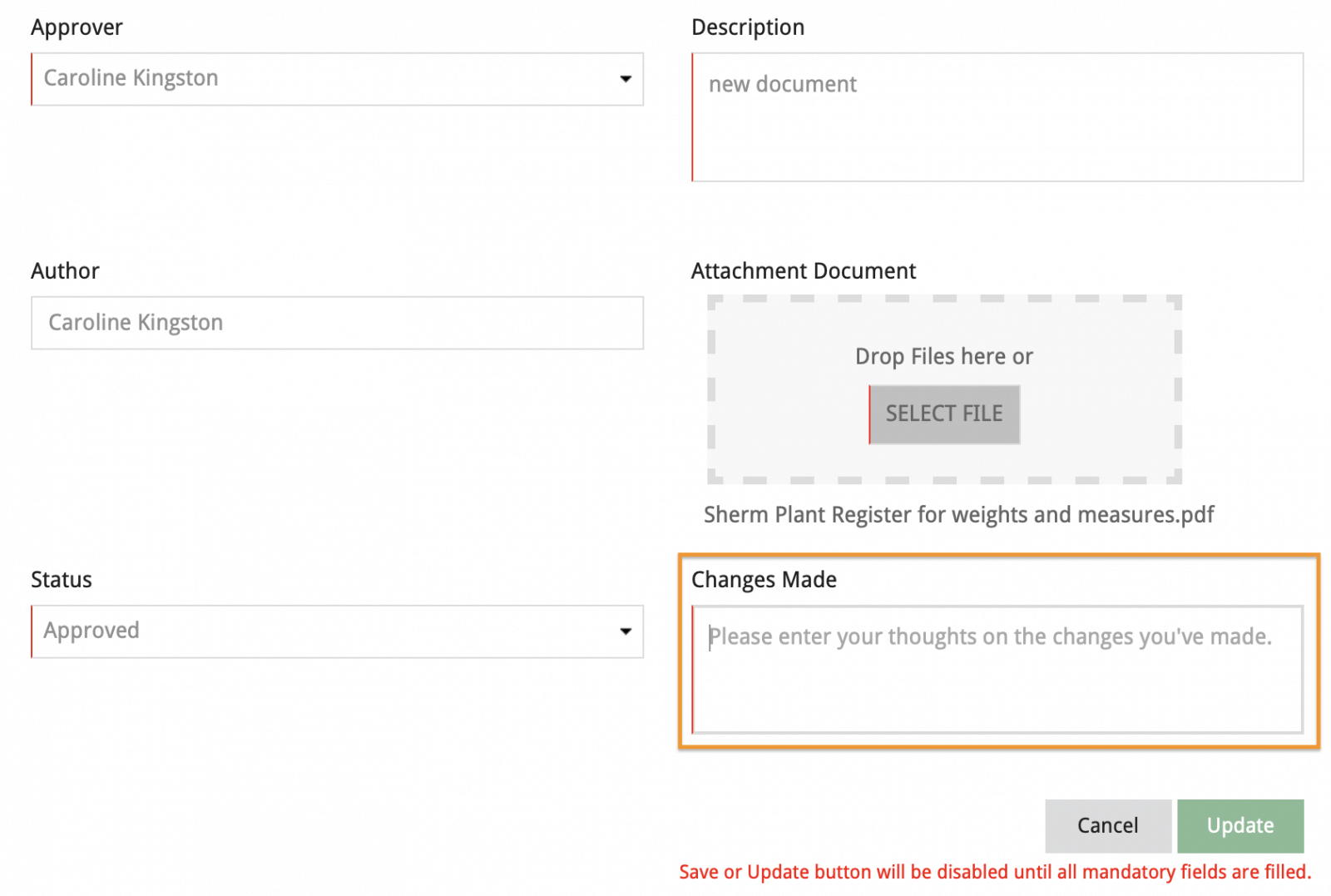 Now, in the Document Register, instead of editing the Description when uploading a new version of a document, a new text box “Changes Made” is provided.