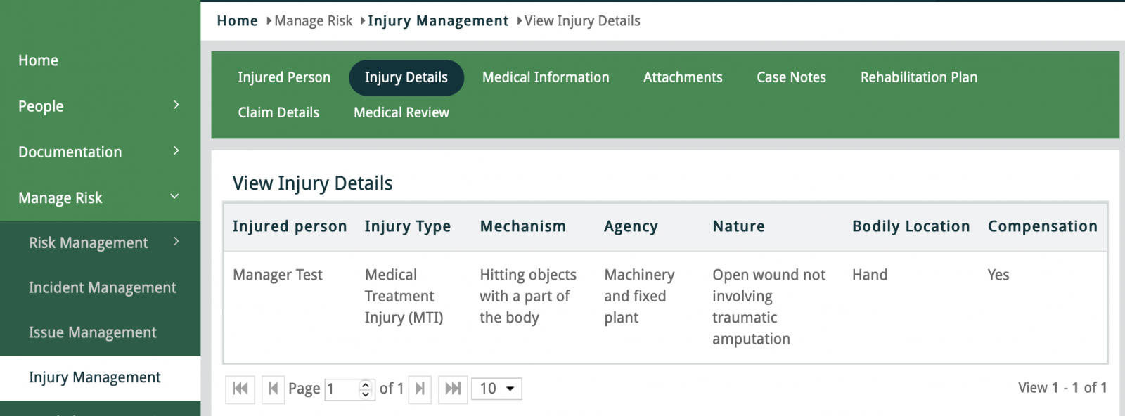 Have included the table from Manage Risk > Incident Management – Injury Details to also display here to make ease of reference.