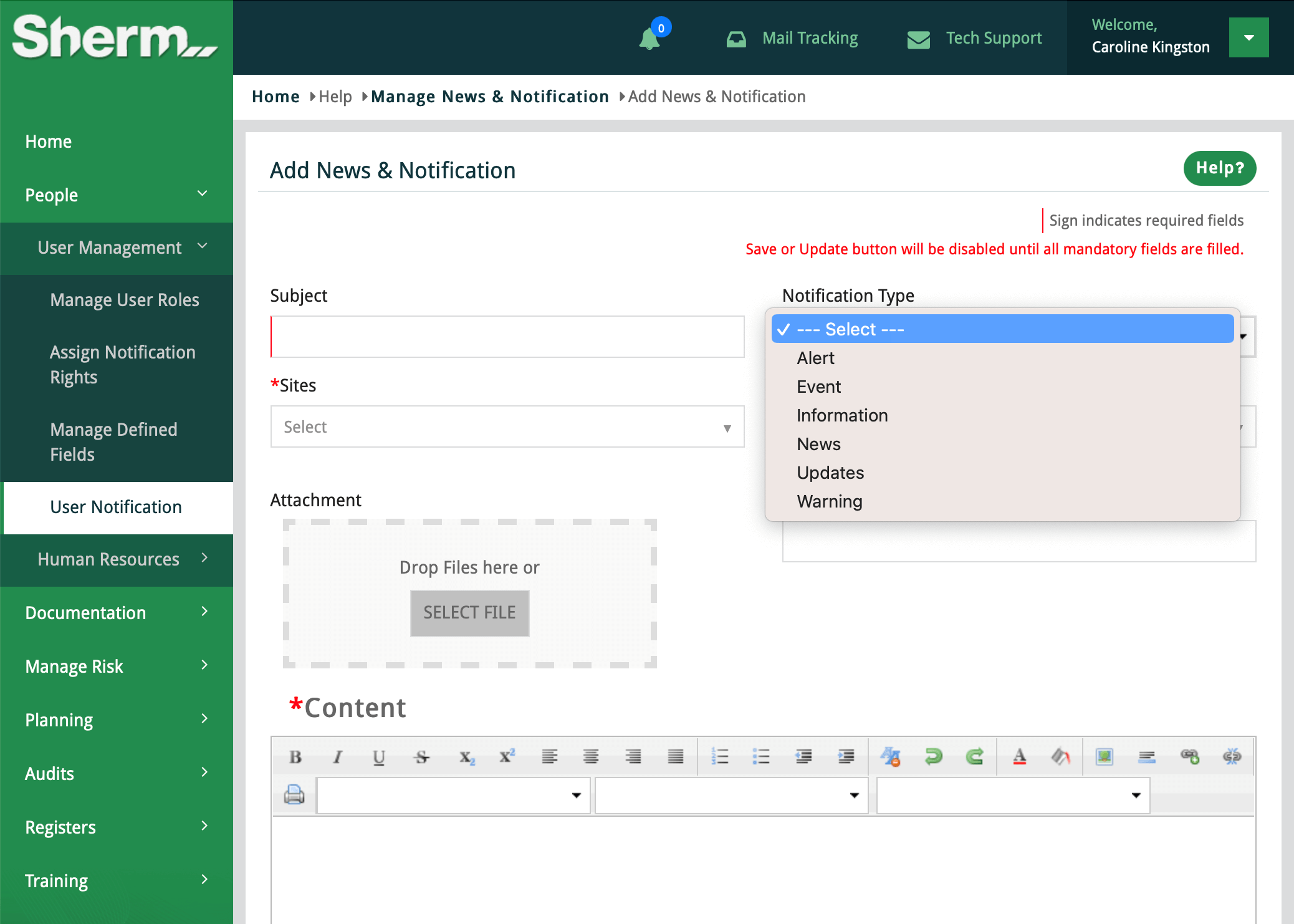 - Notification will be displayed by clicking on Bell icon, when you click on a notification, a popup window with content and attachments will appear