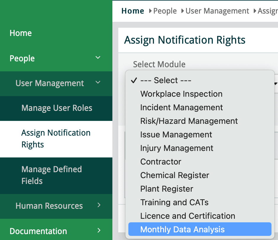 In People > User Management > Assign Notification Rights, there is a new option in Select Module for Monthjly Data Analysis.