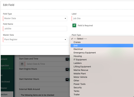 When the Plant Register is selected, there is the option to select Plant Type. This is handy for specific pre-start inspection development for various types of plant as shown below.