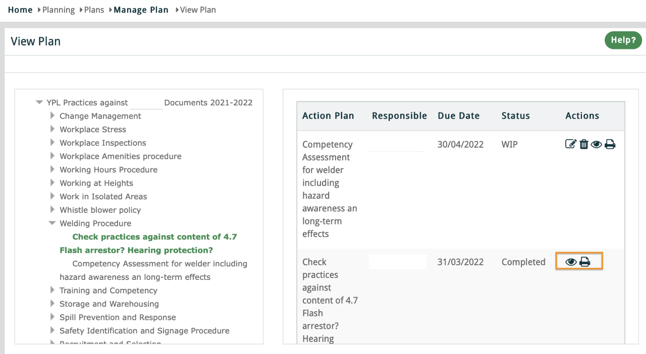 As Responsible Persons can now add Notes to Address Task, a Person with Manage Rights can View those notes and also Print when the Action is “Completed”. The following example also show additional functions for Edit and Delete which is only for those with Manage Rights. Thanks Kerry!